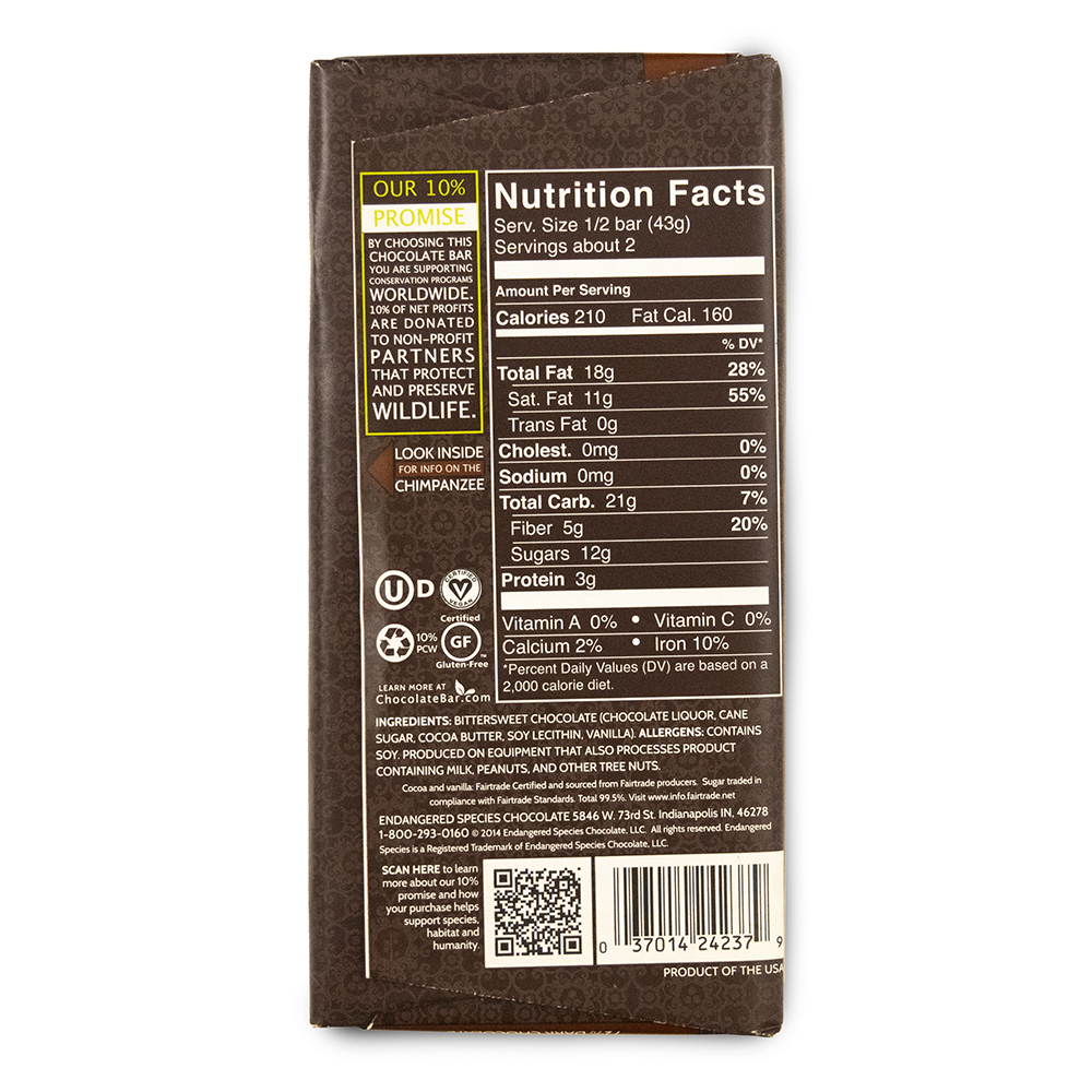 Simple, smooth, sinful. Experience deep, dark chocolate at its best! Increase your knowledge of primates by reading the inside of the wrapper, filled with insightful knowledge about chimpanzees, an at-risk species. Your chocolate purchase tastes all the more sweet knowing that it is supporting conservation efforts.
