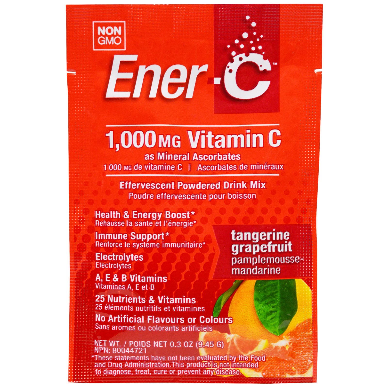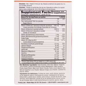 Ingredientes não-medicinais: frutose de cana, ácido cítrico, pó de suco de tangerina natural, bicarbonato de sódio, maltodextrina de tapioca, betacaroteno, batata-doce roxa, ácido málico, dióxido de silício, ácido tartático, ácido aspártico, sumo de toranja natural em pó, , Cisteína HCl, glicina, estevia.
