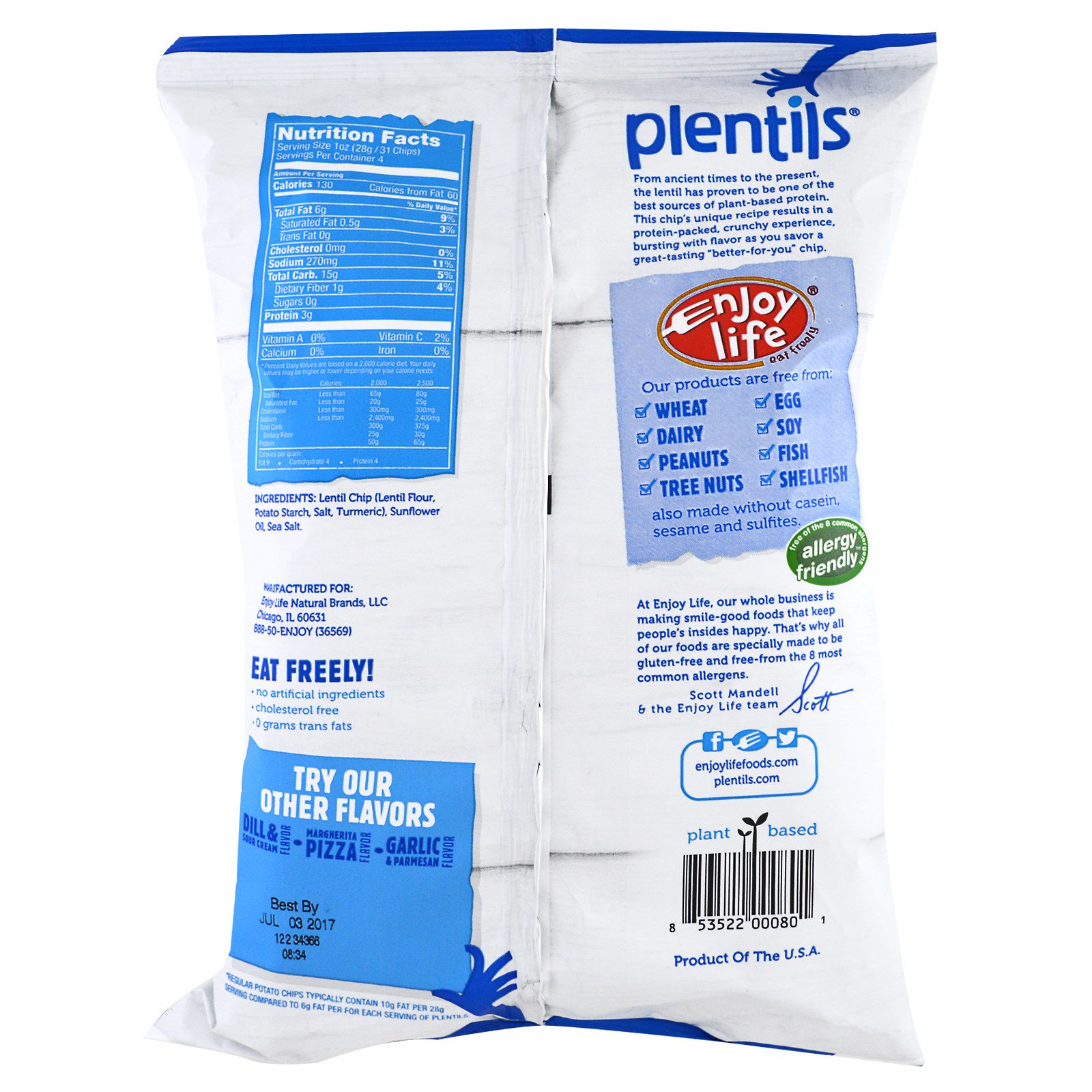 *Chips de batata comuns costumam conter 10 g de gorduras por porção de 28 g, enquanto os chips Plentils contêm 6 g de gorduras por porção.