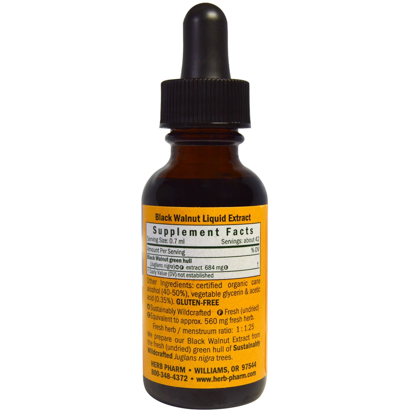 Black Walnut Extract manufactured by Herb Pharm provides 684 mg of Black Walnut green hull extract in each 0.7 ml serving.