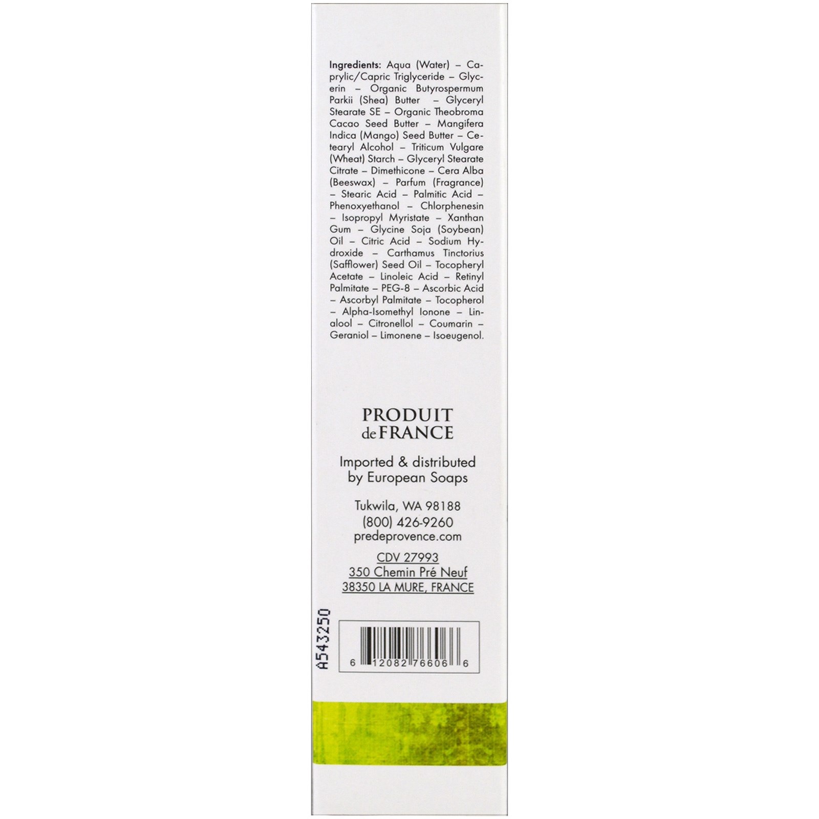 Aqua (água), triglicerídeo caprílico / caprico, glicerina, manteiga orgânica de butyrospermum parkii (shea), estearato de glicerilo SE, manteiga de semente de cacau organo orgânico, mangifera indica (manga) manteiga de semente, álcool cetearílico, amido de triticum vulgare (trigo), estearato de glicerilo citrato, dimeticona, cera alba (cera de abelha), parfum (fragrância), ácido esteárico, ácido palmítico, fenoxietanol, clorofenossina, miristato de isopropilo, goma xantana, óleo de soja (glicina), ácido cítrico, hidróxido de sódio, semente de carthamus tinctorius (cártamo) óleo, acetato de tocoferilo, ácido linoléico, palmitato de retinilo, peg-8, tocoferol, alfa-isometil-ionona, linalol, citronelol, cumarina, geraniol, limoneno, isoeugenol.