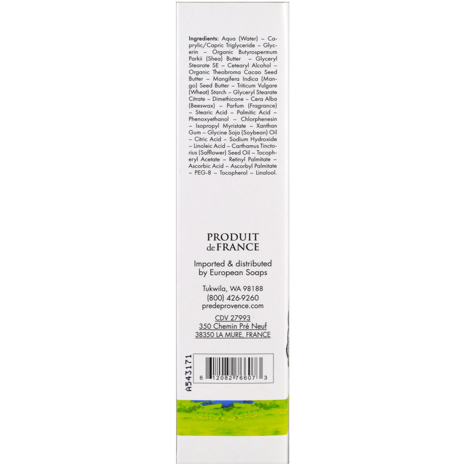 Aqua (água), triglicerídeo caprílico / caprico, glicerina, manteiga orgânica de butyrospermum parkii (shea), estearato de glicerilo SE, álcool cetearílico, manteiga de semente de cacau organo orgânico, mangifera indica (manga) manteiga, triticum vulgare (trigo) amido, estearato de glicerilo citrato, dimeticona, cera alba (cera de abelha), parfum (fragrância), ácido esteárico, ácido palmítico, fenoxietanol, clorofenossina, miristato de isopropilo, goma de xantano, óleo de soja (óleo de soja), ácido cítrico, hidróxido de sódio, ácido linoléico, carthamus tinctorius ( açafrão), acetato de tocoferilo, palmitato de retinilo, ácido ascórbico, palmitato de ascorbilo, peg-8, tocoferol, linalol.