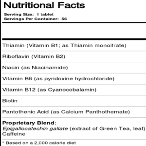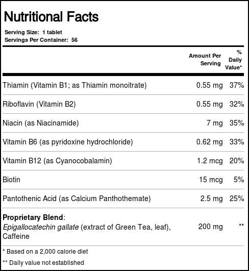 Nota: Enhances metabolism. B Vitamin blend. Green tea extract.