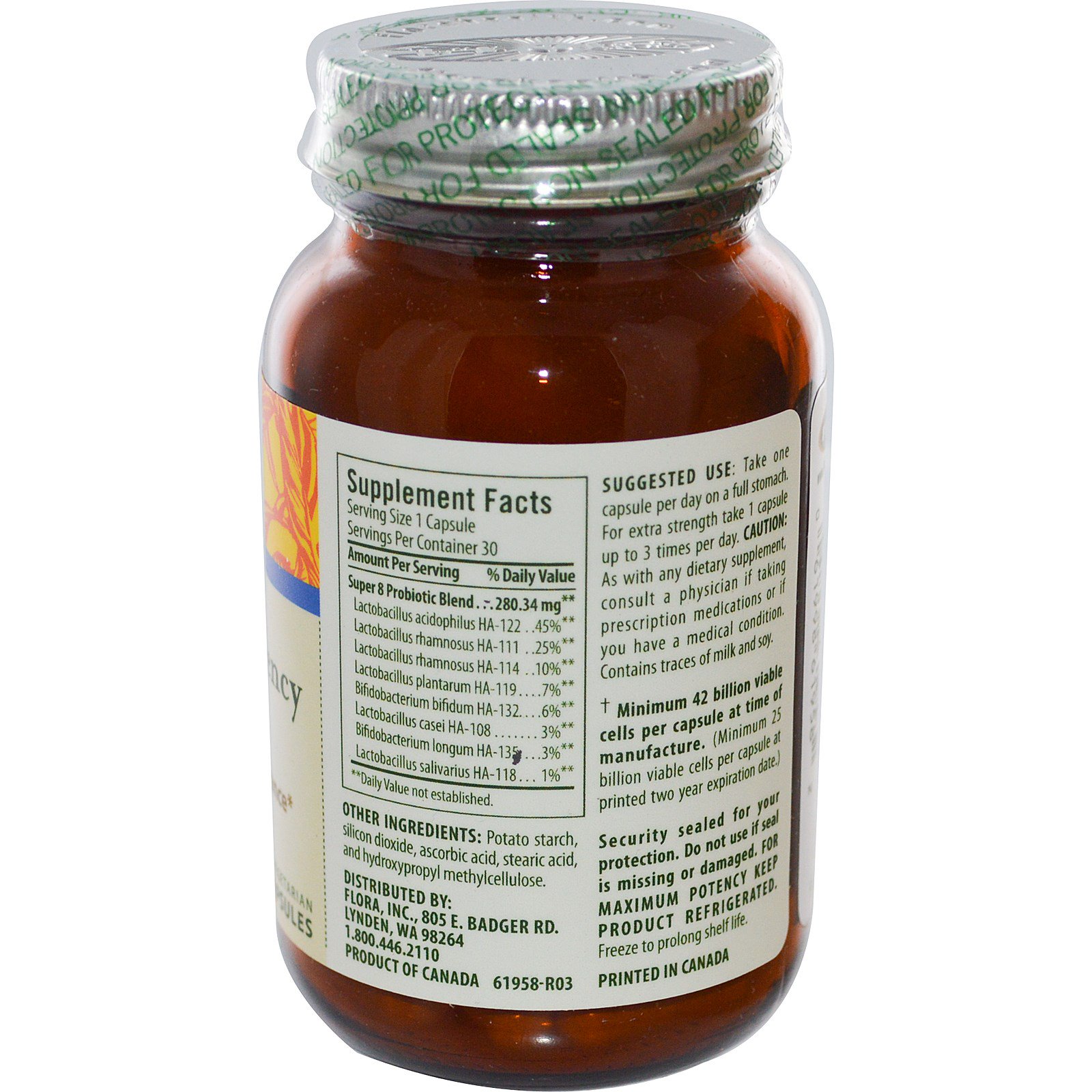 O Probiótico Super 8 inclui 8 cepas de bactérias benéficas. O alto nível de L. acidophilus nesta fórmula ajuda a manter o equilíbrio adequado das leveduras no corpo, e é ideal para viajantes manterem a flora intestinal saudável longe de casa. Como os probióticos são organismos vivos, sua potência diminui lentamente com o tempo (2% ao mês).