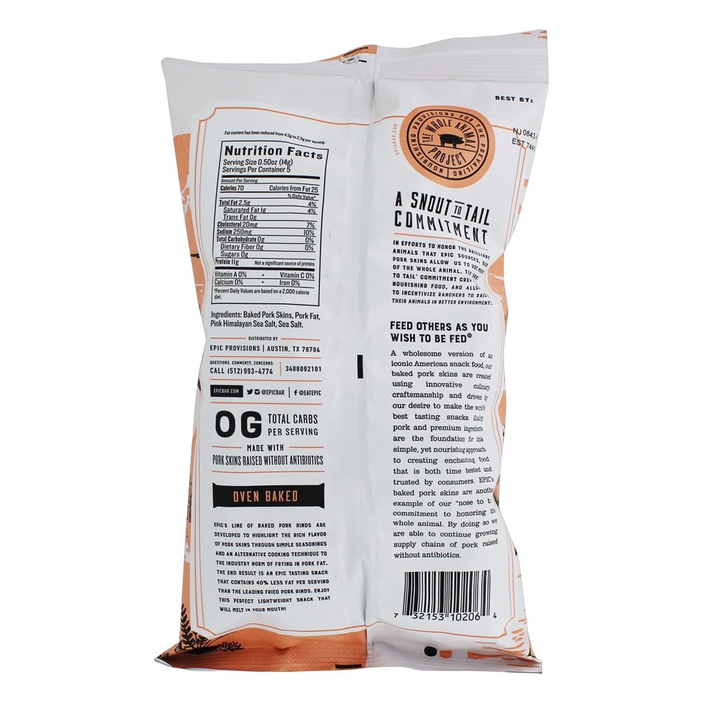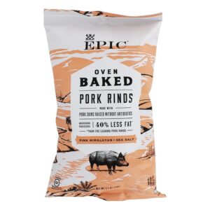 Forno ÉPICO Cascas de Porco Assado O Himalaia Rosa + Sal Marinho é uma versão saudável de um icônico lanche americano, as peles de porco da EPIC são criadas usando métodos tradicionais inspirados pela geração de seus avós. Uma mistura de carne de porco orgânica, não transgênica, pastada e livre de antibióticos combinada com temperos simples é a base para essa abordagem simples, porém nutritiva, de criar alimentos encantadores que são testados e confiados pelo consumidor.