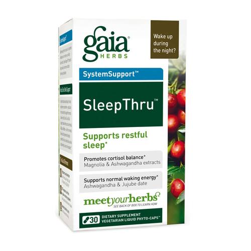 SleepThru by Gaia Herbs is comprised of a Proprietary Synergistic Extract blend of Ashwagandha root, Magnolia bark, Jujube date seed and Passionflower flowering cine.