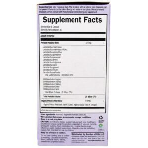 | Mistura Probiótica Prenatal Lactobacillus rhamnosus Lactobacillus rhamnosus HN001 Lactobacillus acidophilus Lactobacillus plantarum Lactobacillus paracasei Lactobacillus brevis Lactobacillus bulgaricus Lactobacillus casei Lactobacillus gasseri Lactobacillus reuteri Lactobacillus salivarius Culturas totais de lacto (15 bilhões de CFU) Bifidobacterium longum Bifidobacterium infantis Bifidobacterium bifidum Bifidobacterium breve Bifidobacterium lactis Culturas totais de Bifido (5 bilhões de CFU) |