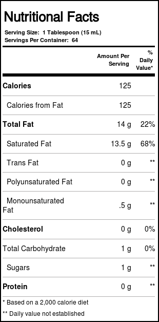 Recomendações de uso: May safely consume between 1-4 tablespoons per day. Use in cooking, frying, baking ou in smoothies. Can be used in place of other oils, including butter.