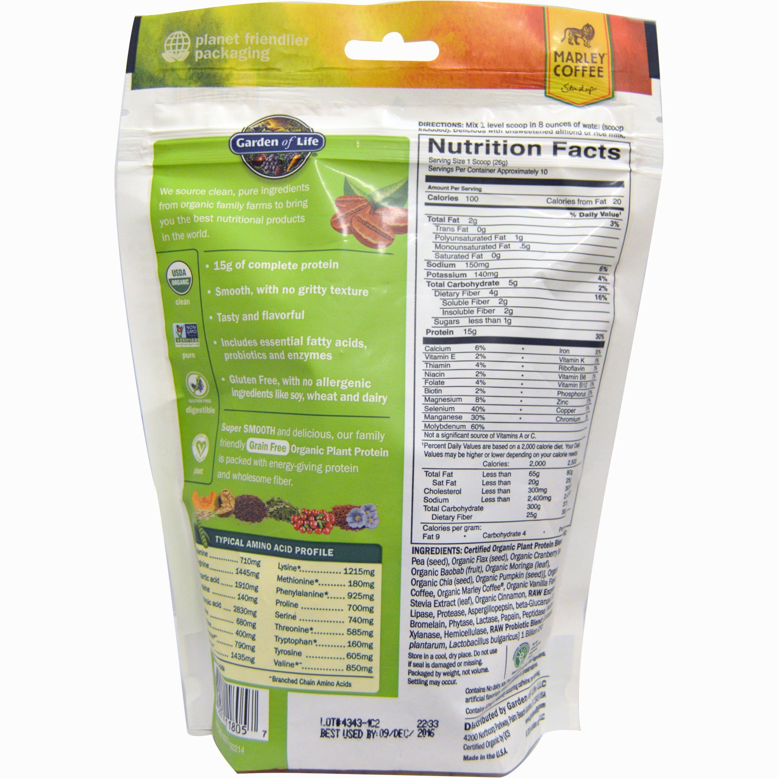 Mistura Orgânica Certificada de Proteína Vegetal: [Ervilha orgânica (semente), linho orgânico (semente), oxicoco orgânico (semente), baobá orgânico (fruto), moringa orgânica (folha), chia orgânica (semente), abóbora orgânica (semente)], café arábica orgânico, Marley café orgânico, sabor de baunilha orgânica, extrato de estévia orgânica (folha), canela orgânica, mistura de enzimas crus: lipase, protease, aspergillopepsin, beta-glucanase, celulase, bromelina, fitase, lactase, papaína, peptidase, pectinase, xilanase, hemicelulase, mistura probiótica bruta: [Lactobacillus plantarum, Lactobacillus bulgaricus] 1 bilhão de UFC.