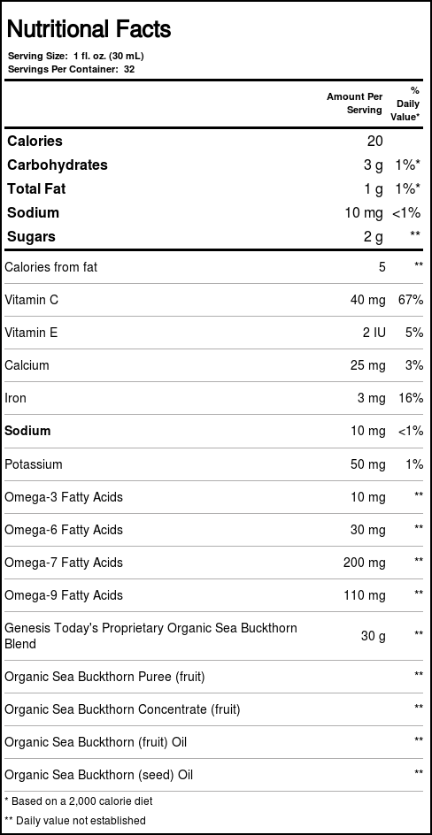 b>Sea Buckthorn 100 by Genesis Today is made with 100% Pure Sea Buckthorn Juice.