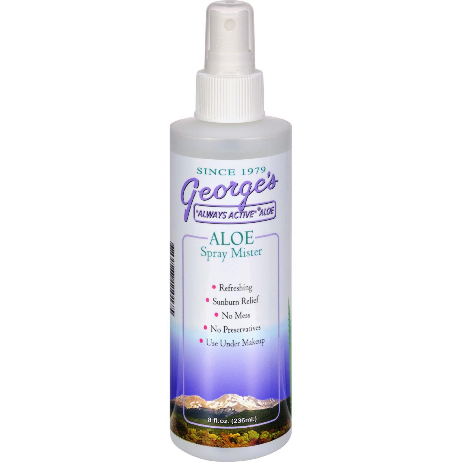 George’s Always Active Aloe Spray Mister Description: Refreshing Sunburn Relief No Mess No Preservatives Use Under Makeup A cooling refreshing spray. Free Of Preservatives. Disclaimer These statements have not been evaluated by the FDA. These products are not intended to diagnose, treat, cure, or prevent any disease.