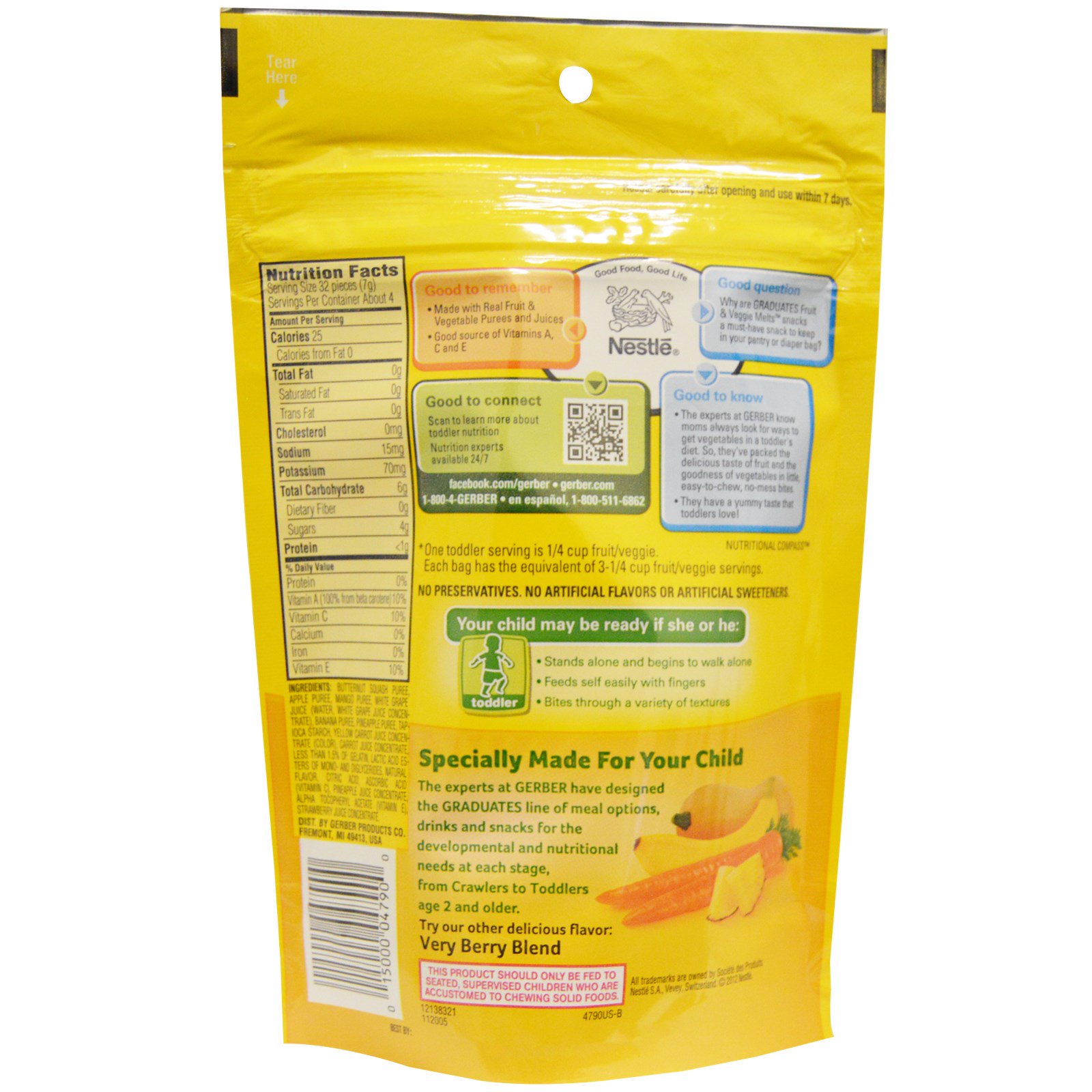 - Os especialistas em Gerber sabem que as mães sempre procuram maneiras de inserir vegetais na dieta de crianças pequenas. Então, eles embalaram um delicioso sabor de frutas e os benefícios dos vegetais em pequenos aperitivos, fáceis de morder e que evitam bagunças.