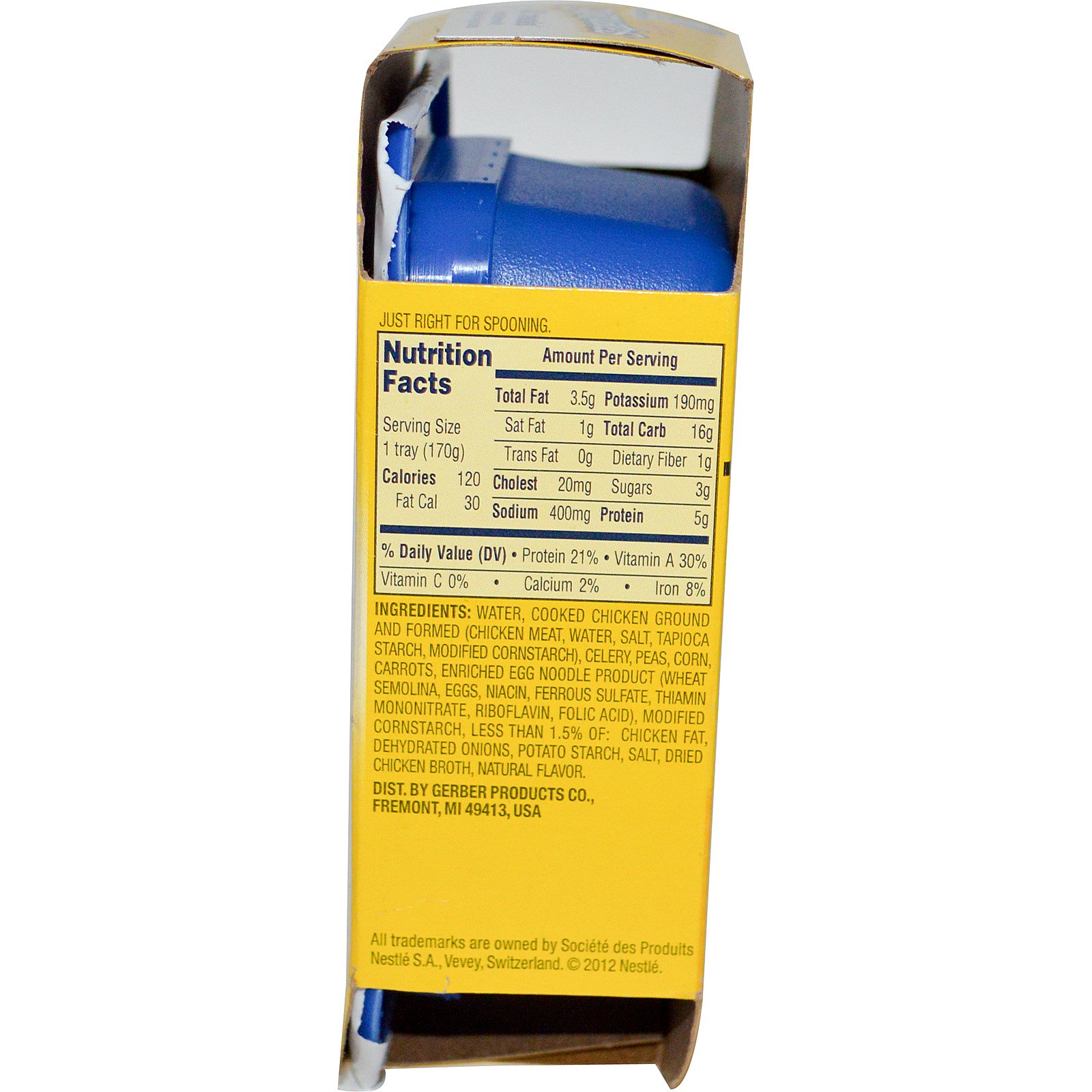 Água, frango cozido moído e formado (carne de frango, sal de água, amido de tapioca, amido de milho modificado), aipo, ervilhas, milho, cenouras, produto de macarrão de ovo enriquecido (whet semolina, ovos, niacina, sulfato ferroso, mononitrato de tiamina, riboflavina, Ácido), amido de milho modificado, menos de 1,5% de: gordura de frango, cebola desidratada, amido de batata, sal, caldo de galinha seco, sabor natural.