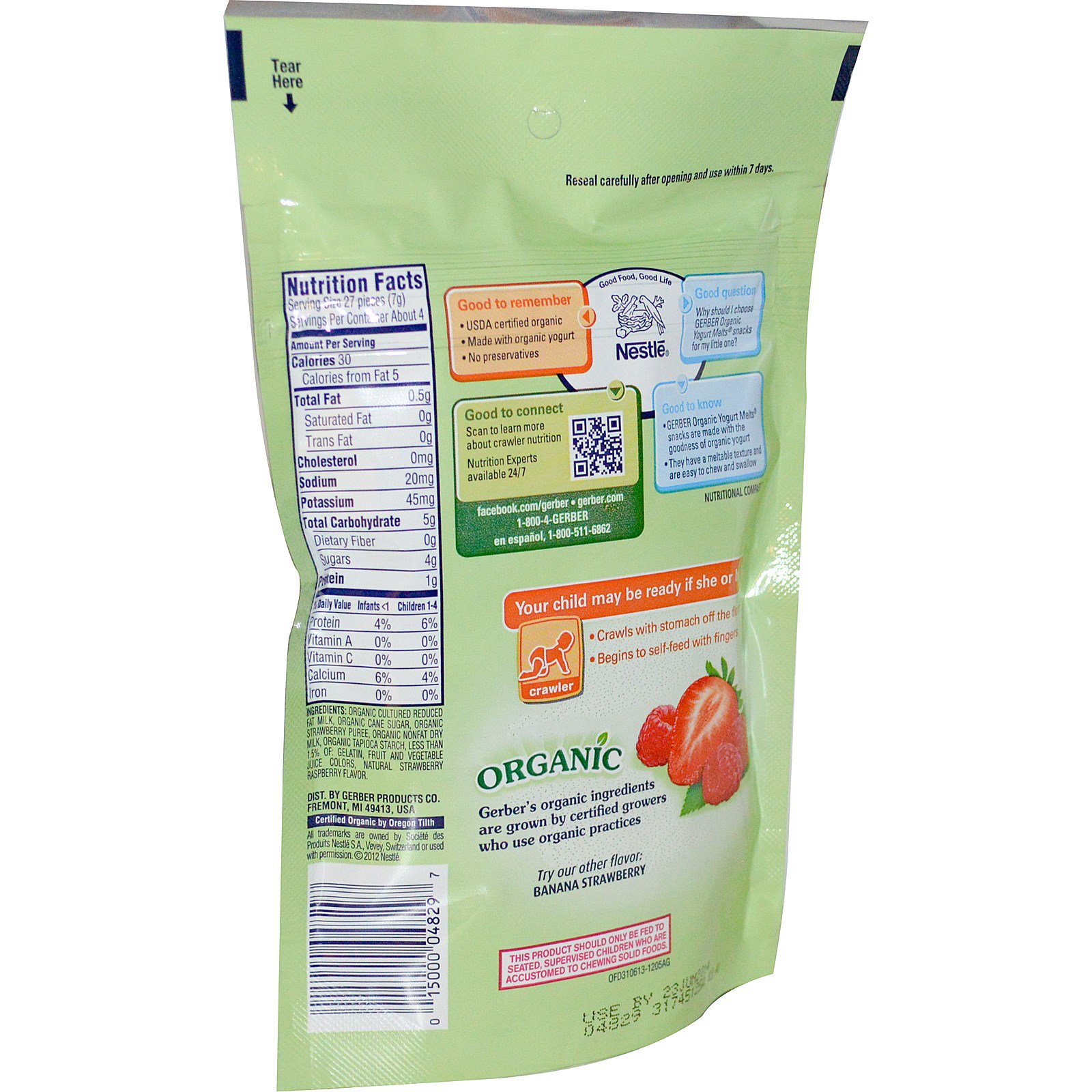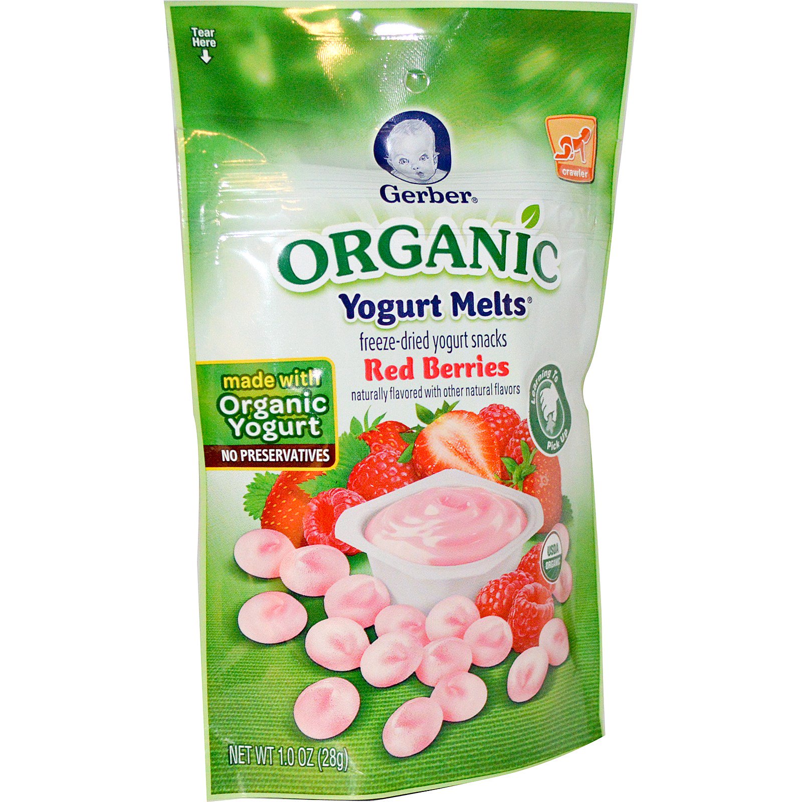- Os Gerber Organic Yogurt Melts são feitos com o sabor e os benefícios do iogurte orgânico.
