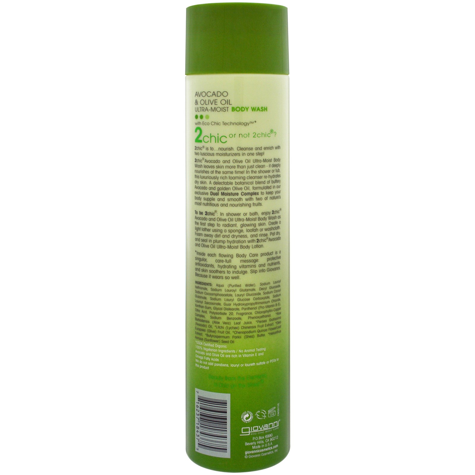 To be 2chic: In shower or bath, enjoy 2chic Avocado and Olive Oil Ultra-Moist Body Wash as the first step to radiant, glowing skin. Create a light lather using a sponge, loofah or washcloth. Foam away dirt and dryness, and rinse. Pat dry, and seal in plump hydration with 2chic Avocado and Olive Oil Ultra-Moist Body Lotion.
