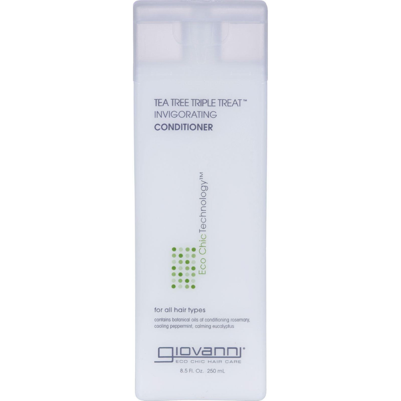 Giovanni Conditioner Tea Tree Triple Treat Description: Tea Tree Triple Treat Invigorating Conditioner For All Hair Types A plethora of stimulating ingredients provide a tingling sensation that soothes and smoothes hair and scalp Increases scalp circulation for a refreshed renewed feel Strengthens hair with a three-organic-oil-blend to stimulate, condition and calm Alleviates dry, flaking scalp with organic tea tree botanicals Encourages natural shine and resilience. Free Of No animal by-products. Cruelty free. Disclaimer These statements have not been evaluated by the FDA. These products are not intended to diagnose, treat, cure, or prevent any disease.
