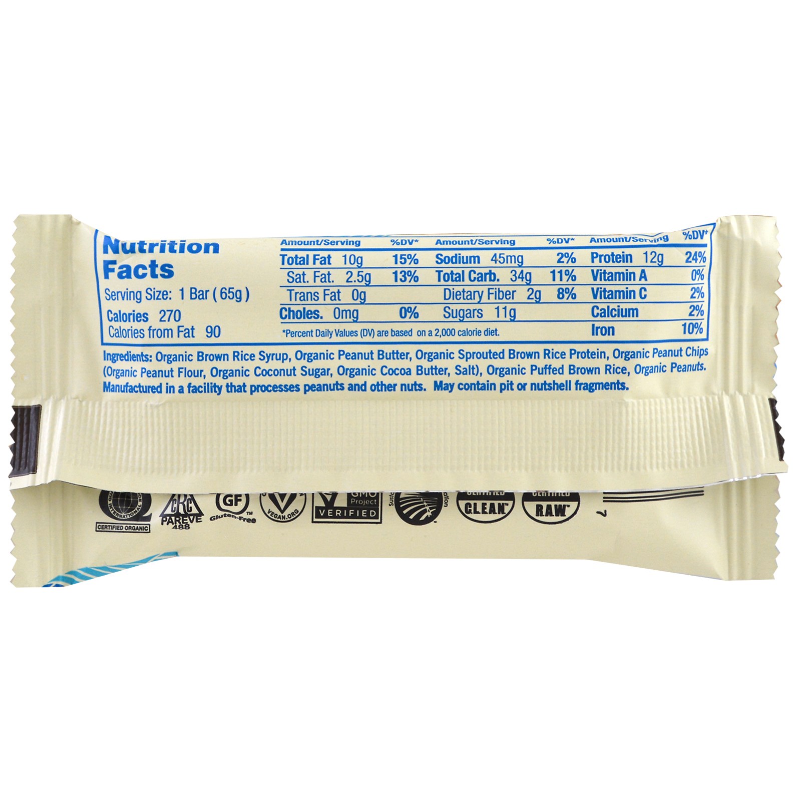 Xarope de arroz marrom orgânico, manteiga de amendoim orgânica, proteína de arroz integral germinada orgânica, chips de amendoim orgânicos (farinha de amendoim orgânica, açúcar de coco orgânico, manteiga de cacau orgânica, sal), arroz integral orgânico, amendoim orgânico.
