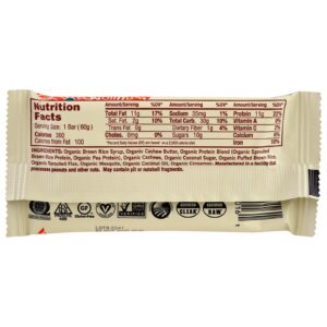 Xarope de arroz orgânico, manteiga de caju orgânica, mistura de proteína orgânica (proteína de arroz integral gerada por orgãos, proteína de erva orgânica), castanha de caju orgânica, açúcar de coco orgânico, arroz integral orgânico, linho germinado orgânico, mesquite orgânica, óleo de coco orgânico, canela orgânica.