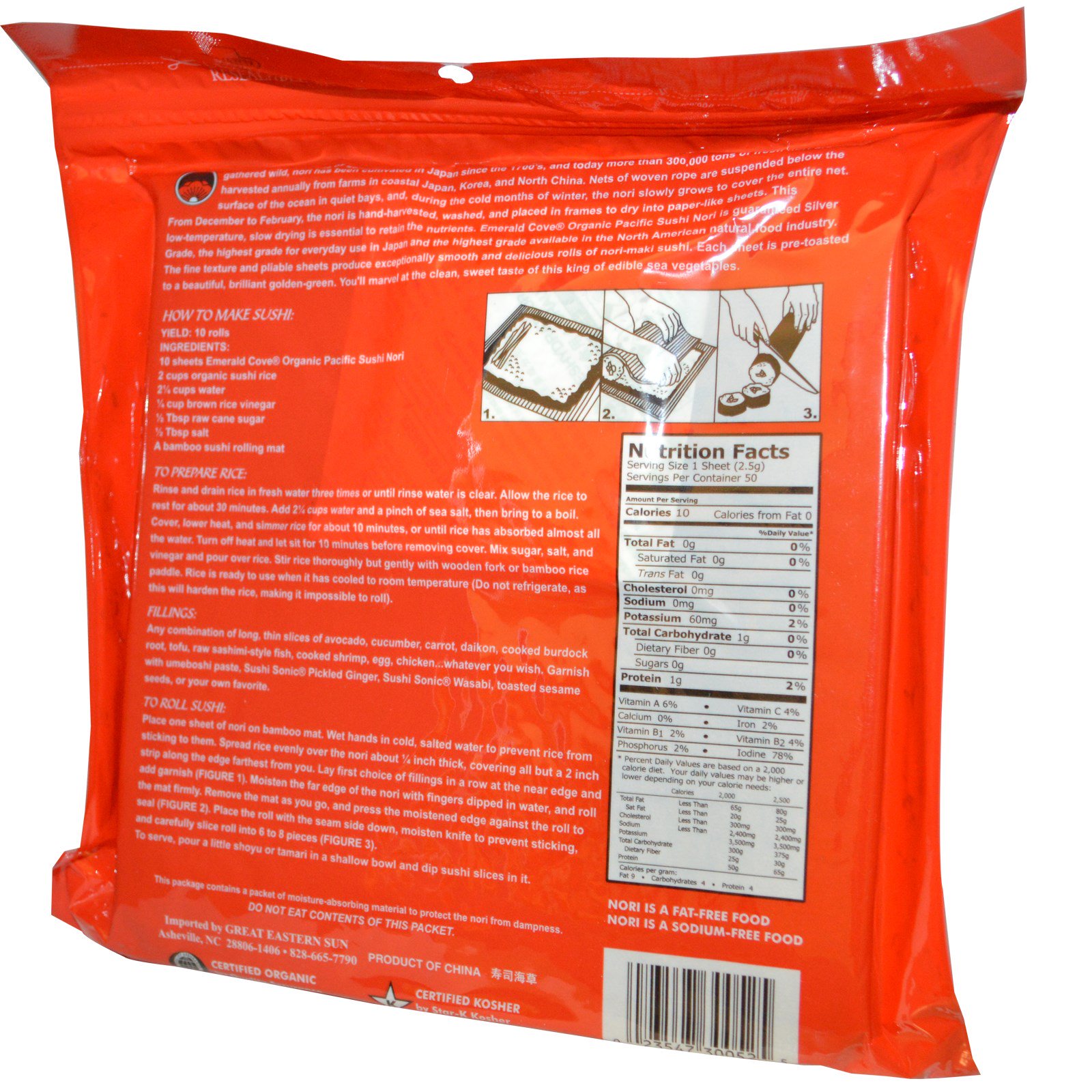 Of the scores of kinds of seaweeds consumed around the world, nori is the overwhelming favorite. Although originally gathered wild, nori has been cultivated in Japan since the 1700’s, and today more than 300,000 tons of fresh nori are harvested annually from farms in coastal Japan, Korea, and North China. Nets of woven rope are suspended below the surface of the ocean in quiet bays, and, during the cold months of winter, the nori slowly grows to cover the entire net. From December to February, the nori is hand-harvested, washed, and placed in frames to dry into paper-like sheets. This low-temperature, slow drying is essential to retain the nutrients. Emerald Cove Organic Pacific Sushi Nori is guaranteed Silver Grade, the highest grade for everyday use in Japan and the highest grade available in the North American natural food industry. The fine texture and pliable sheets produce exceptionally smooth and delicious rolls of nori-maki sushi. Each sheet is pre-toasted to a beautiful, brilliant golden-green. You’ll marvel at the clean, sweet taste of this king of edible sea vegetables.