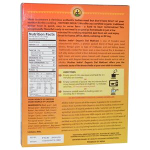 Mother India Organic Dal Makhani is one of Punjab’s most characteristic dishes, a protein packed blend of black gram (urad beans), Bengal gram (a type of chickpea), and red kidney beans. Traditionally cooked for hours over a slow charcoal fire, it develops a rich silky texture which is then delicately tempered and seasoned with light cream and exotic spices. Garnish with chopped coriander leaves and serve with fragrant basmati rice and Indian breads such as roti or phulka. Mother India Organic Dal Makhani offers you the authentic taste of Northwest India at your own table in minutes.