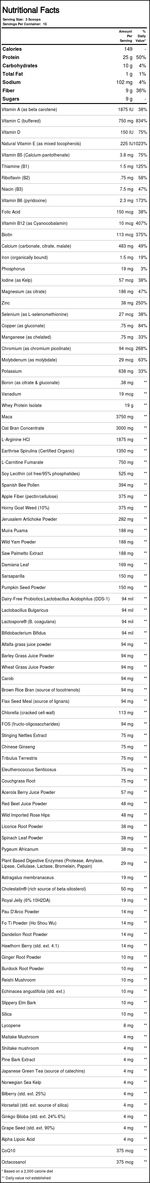 Outros ingredientes: Cenoura em Pó, couve em Pó, Tomate em Pó, Brócolis em Pó, Bioflavonóides Tangerina, Suco de Cereja em Pó, Baunilha Natural, Levulose, Maltodextrina, galactomanana, Stevia.