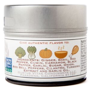 Gengibre, manjericão, pimenta vermelha, cominho, cardamomo, pimenta preta, alho, açúcar, cebola, pimentões vermelhos, coentro, extrato de açafrão e óleo de alho.