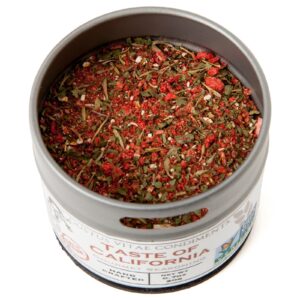 A delightful composition of savory, zesty, and sweet notes, Taste of California is a rich, flavorful blend of the natural bounty of California. Dried strawberries lend beautiful color and a lingering sweetness while the cilantro, thyme and tarragon add depth and warmth. The natural zest of the lemon peels bring a refreshing sharpness. Apply the Taste of California to fish, chicken, vegetable, and pork dishes prior to cooking-or sprinkle on fresh salads for vibrant color and complexity of flavor. Taste of California works beautifully as a marinade or sauce too: mix in a generous helping of the blend into a cup of yogurt or coconut cream and savor the rich flavors of the Golden State!