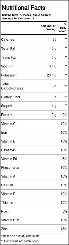Recomendações de uso: Have your little one enjoy 75 pieces or about 1/2 cup as a healthy snack.