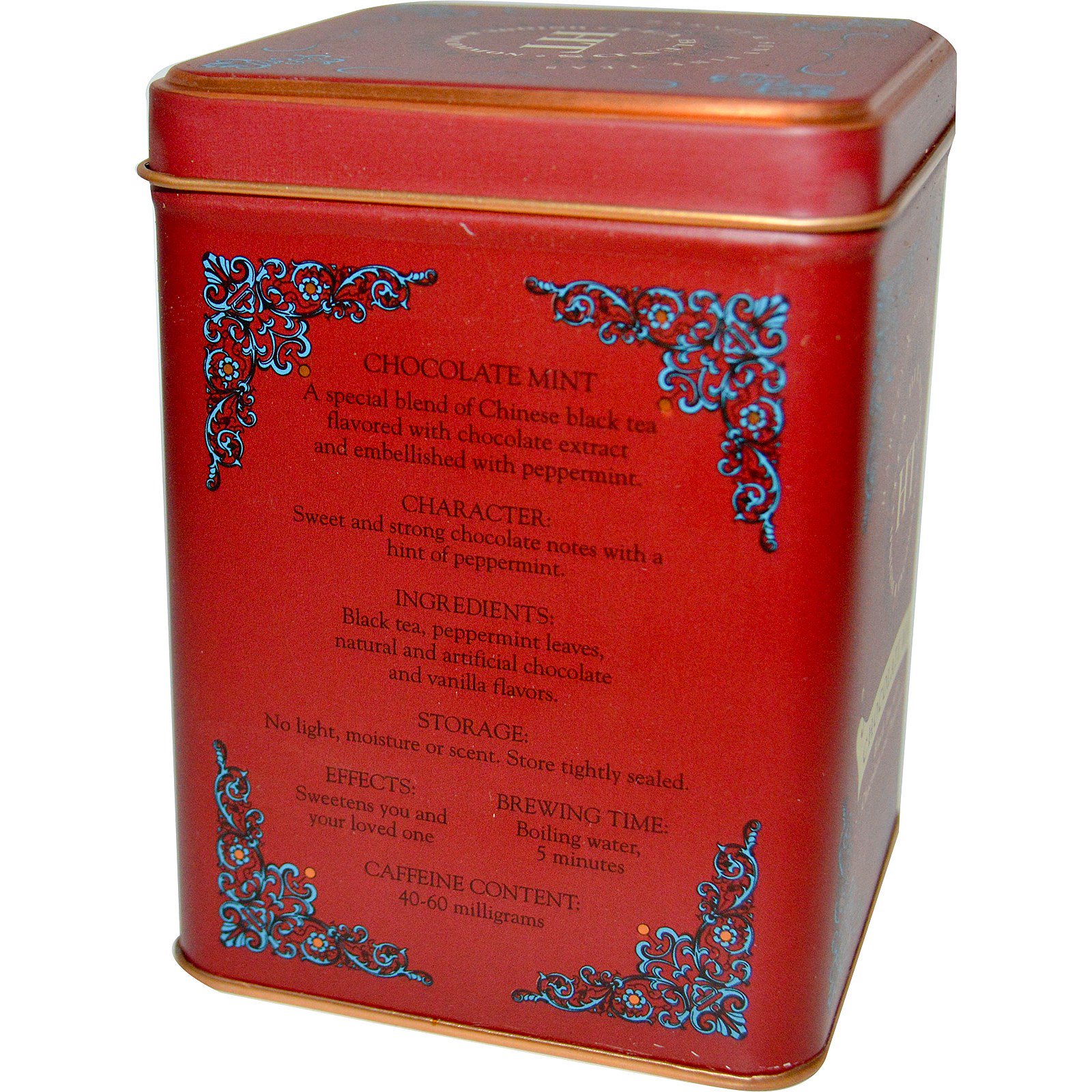 Chá preto, folhas de hortelã-pimenta, chocolate natural e artificial e sabores de baunilha.