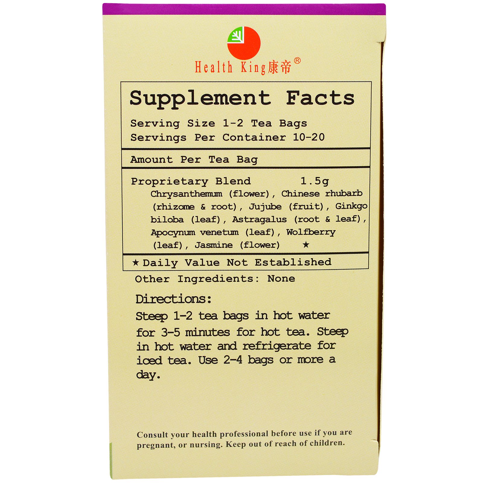 Consult your health professional before use if you are pregnant, or nursing. Keep out of reach of children.