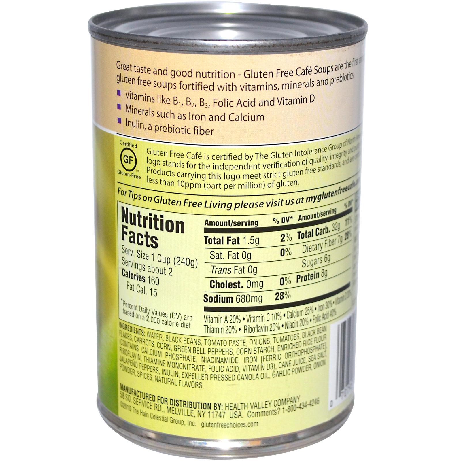 Água, feijão preto, pasta de tomate, cebola, tomate, flocos de feijão preto, cenoura, milho, pimentão verde, amido de milho, farinha de arroz enriquecida (contém fosfato de cálcio, niacinamida, ferro [ortofosfato férrico], riboflavina, mononitrato de tiamina, ácido fólico , Vitamina D3), pode suco, sal marinho, pimentas jalapeño, inulina, expeller comprimido óleo de canola, alho em pó, cebola em pó, especiarias, sabores naturais.