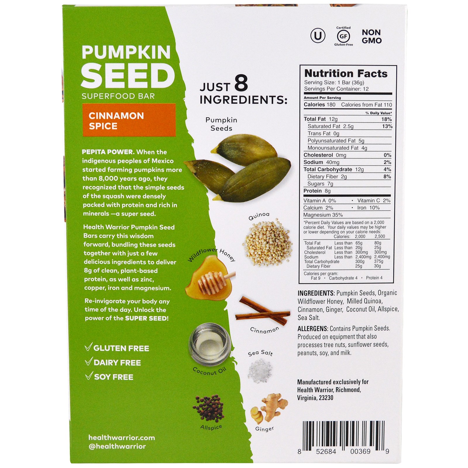Sementes de abóbora, mel silvestre orgânico, quinoa moída, canela, gengibre, óleo de coco, pimenta da Jamaica, sal marinho.