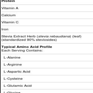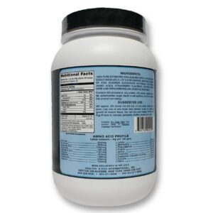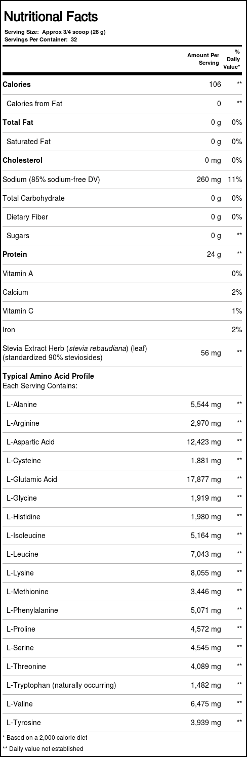 Notas: Contains no cholesterol, soy protein, milk protein, gelatin, and no fat, carbohydrate, sugar, starch or salt additives. All amino acids in this product are natural. Contains no trans fats. Soy lecithin helps to naturally instantize the product.