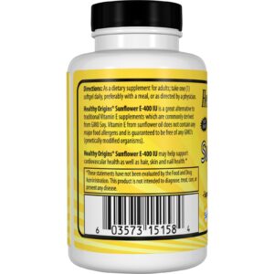 O Healthy Origins Sunflower E-400 UI é uma ótima alternativa aos suplementos tradicionais de vitamina E que são comumente derivados de soja transgênica. A vitamina E do óleo de girassol não contém alergênios alimentares importantes e é garantida como estando livre de quaisquer OGMs (organismos geneticamente modificados).