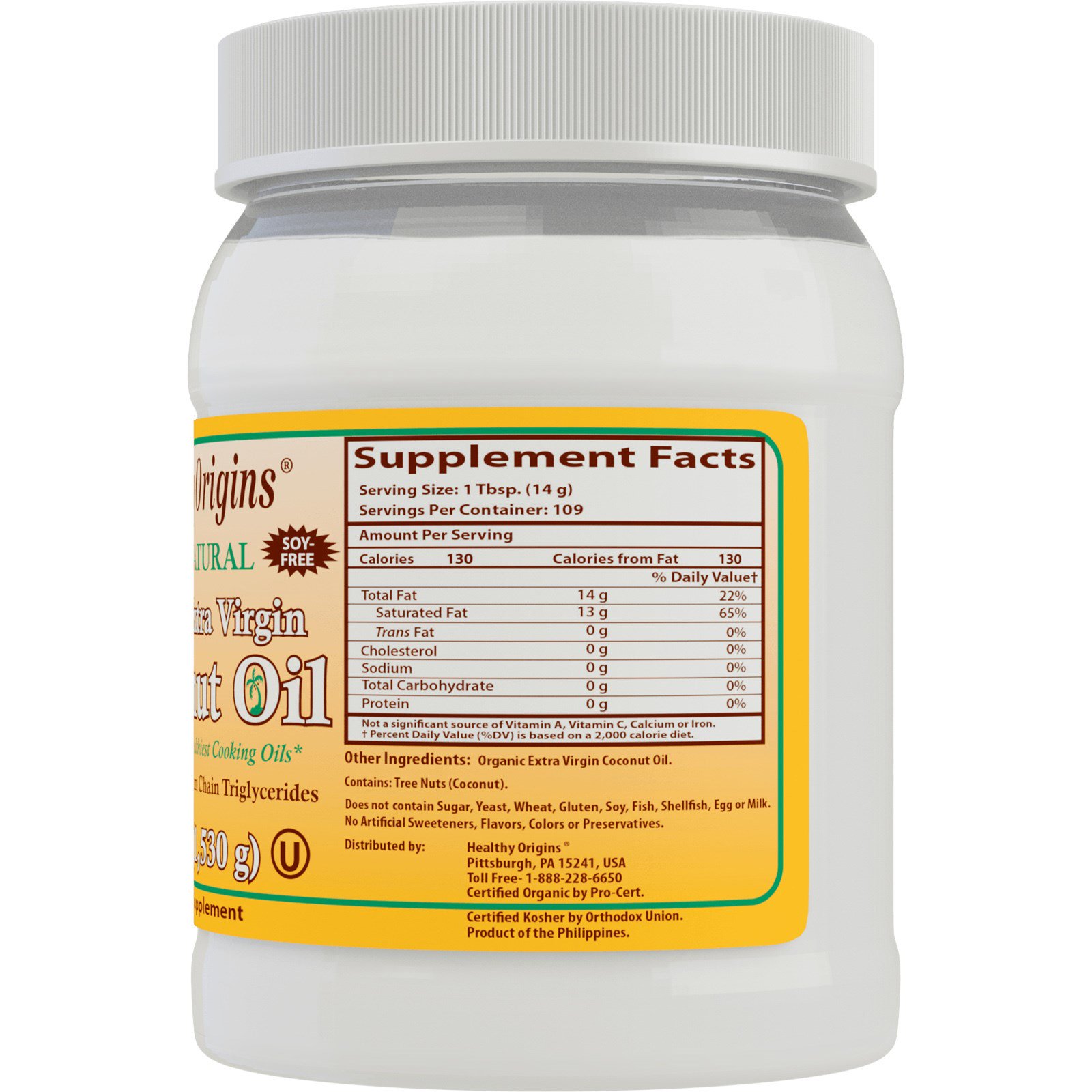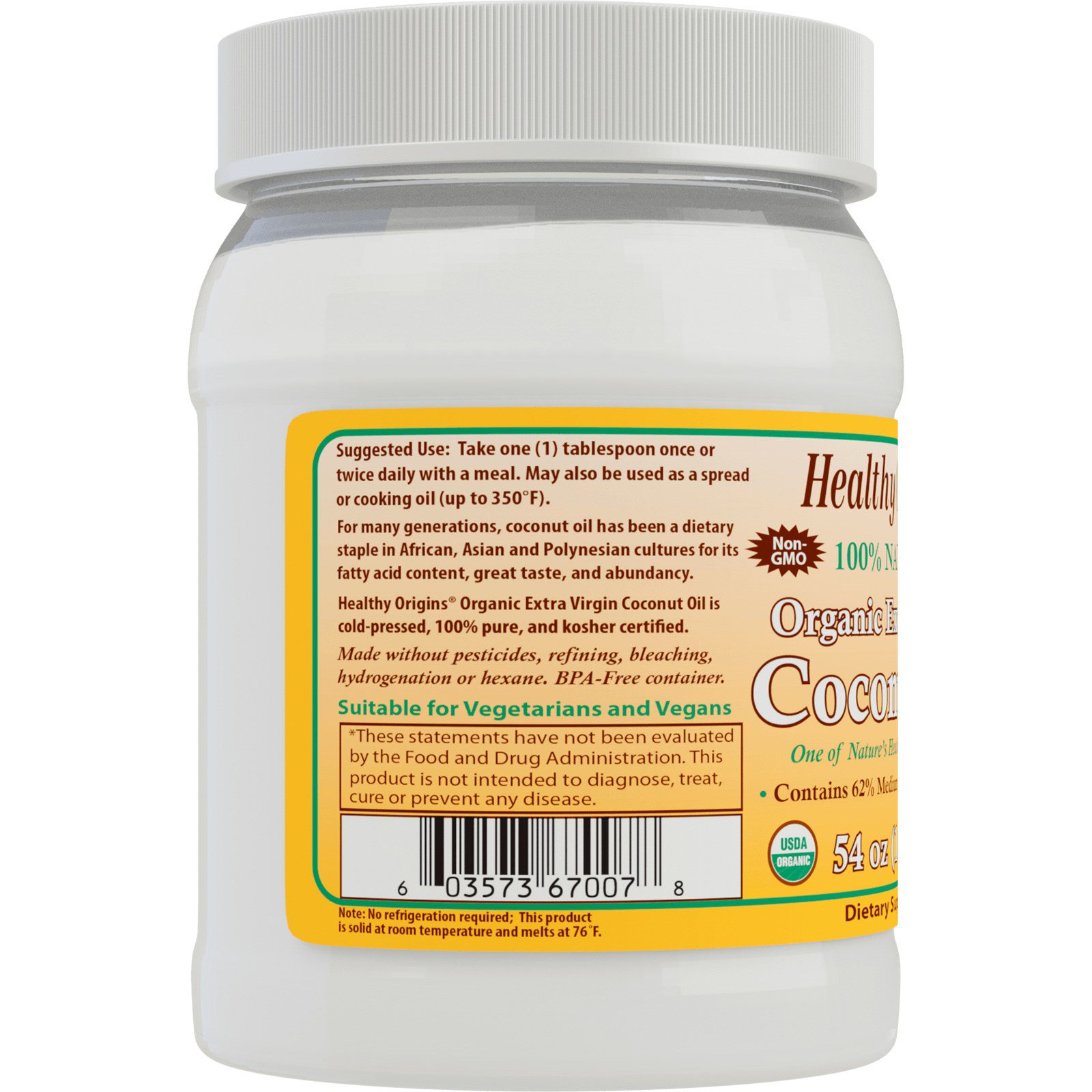 Healthy Origins Organic Extra Virgin Coconut Oil is cold-pressed, 100% pure, and kosher certified.