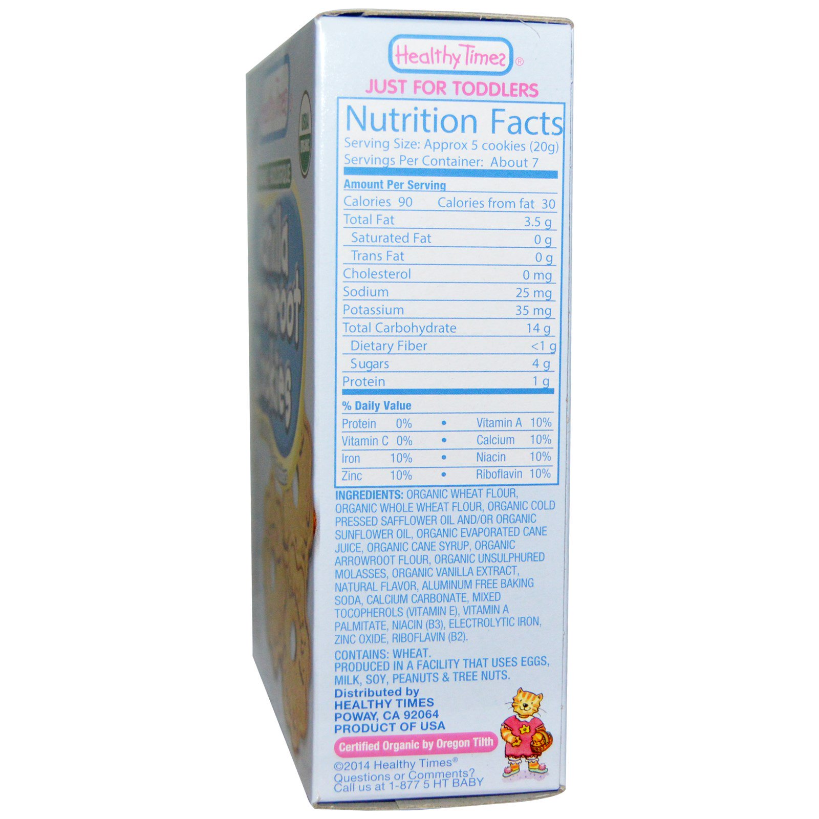 Farinha de trigo orgânica, farinha de trigo integral orgânica, óleo de cártamo orgânico frio e / ou óleo de girassol orgânico, suco de cana evaporado orgânico, xarope de cana orgânico, farinha de araruta orgânica, melaço orgânico não sulfurado, extrato de baunilha orgânico, sabores naturais, Carbonato de cálcio, tocoferóis misturados (vitamina E), palmitato de vitamina A, niacina (B3), ferro electrolítico, óxido de zinco, riboflavina (B2).