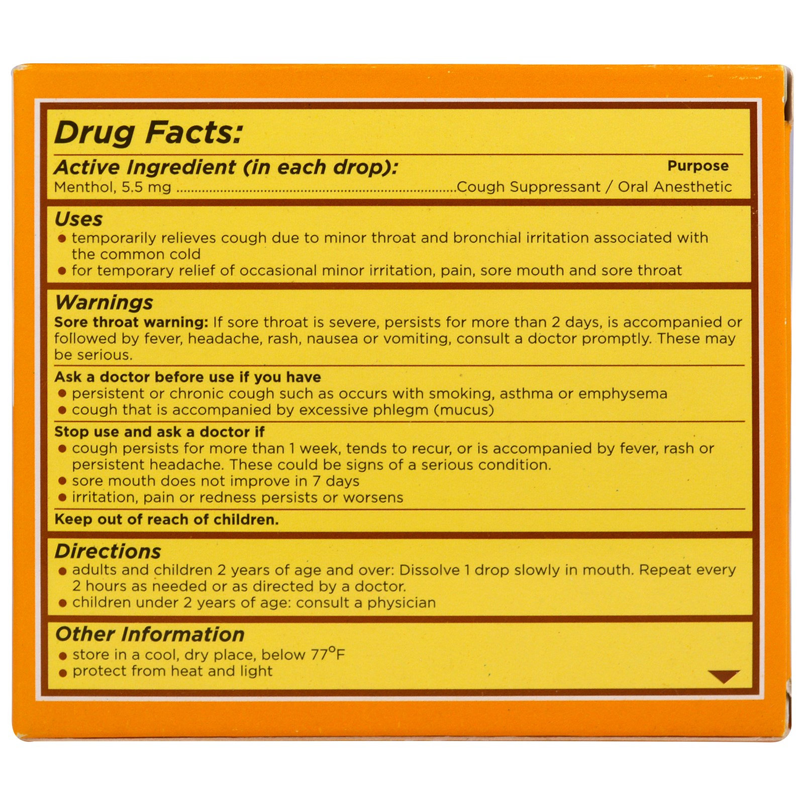 - Adults and children 2 years of age and over: Dissolve 1 drop slowly in mouth. Repeat every 2 hours as needed or as directed by a doctor.