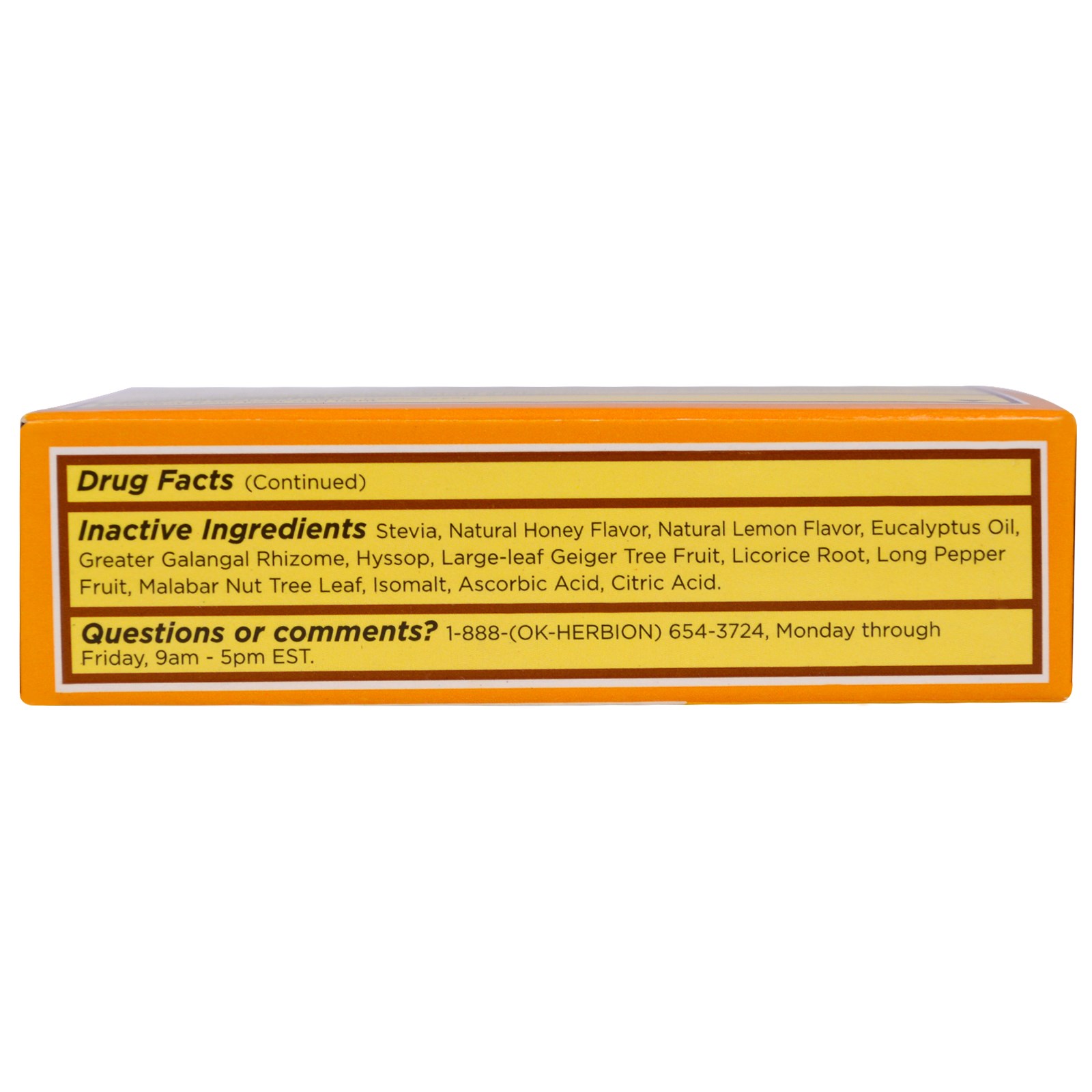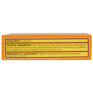 | Ingredientes Inativos: Stevia, sabor natural do mel, sabor natural ao limão, óleo de eucalipto, rizoma galangal maior, hissopo, fruta da árvore geiger grande, raiz de alcaçuz, frango longo, folha da árvore da noz malabar, isomalt, ácido ascórbico, ácido cítrico. | |