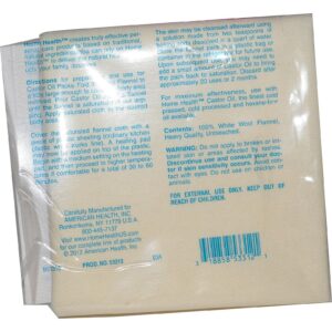 Directions for preparation and use for Castor Oil Packs: Fold the Wool Flannel to a size large enough to cover the body area involved. Pour Castor Oil into the flannel until the flannel is saturated but not dripping. Apply saturated cloth to the desired body area.