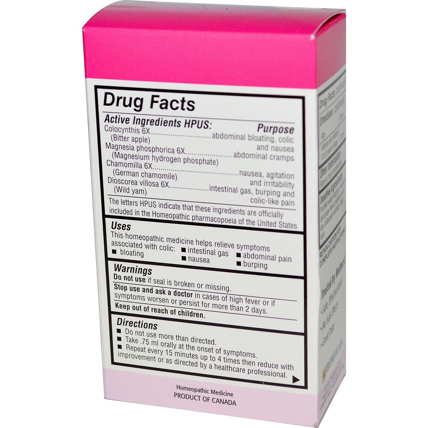 Active Ingredients HPUS: Colocynthis 6X (Bitter apple), Magnesia phosphorica 6X (Magnesium hydrogen phosphate), Chamomilla 6X (German chamomile) and Dioscorea villosa 6X (Wild yam).