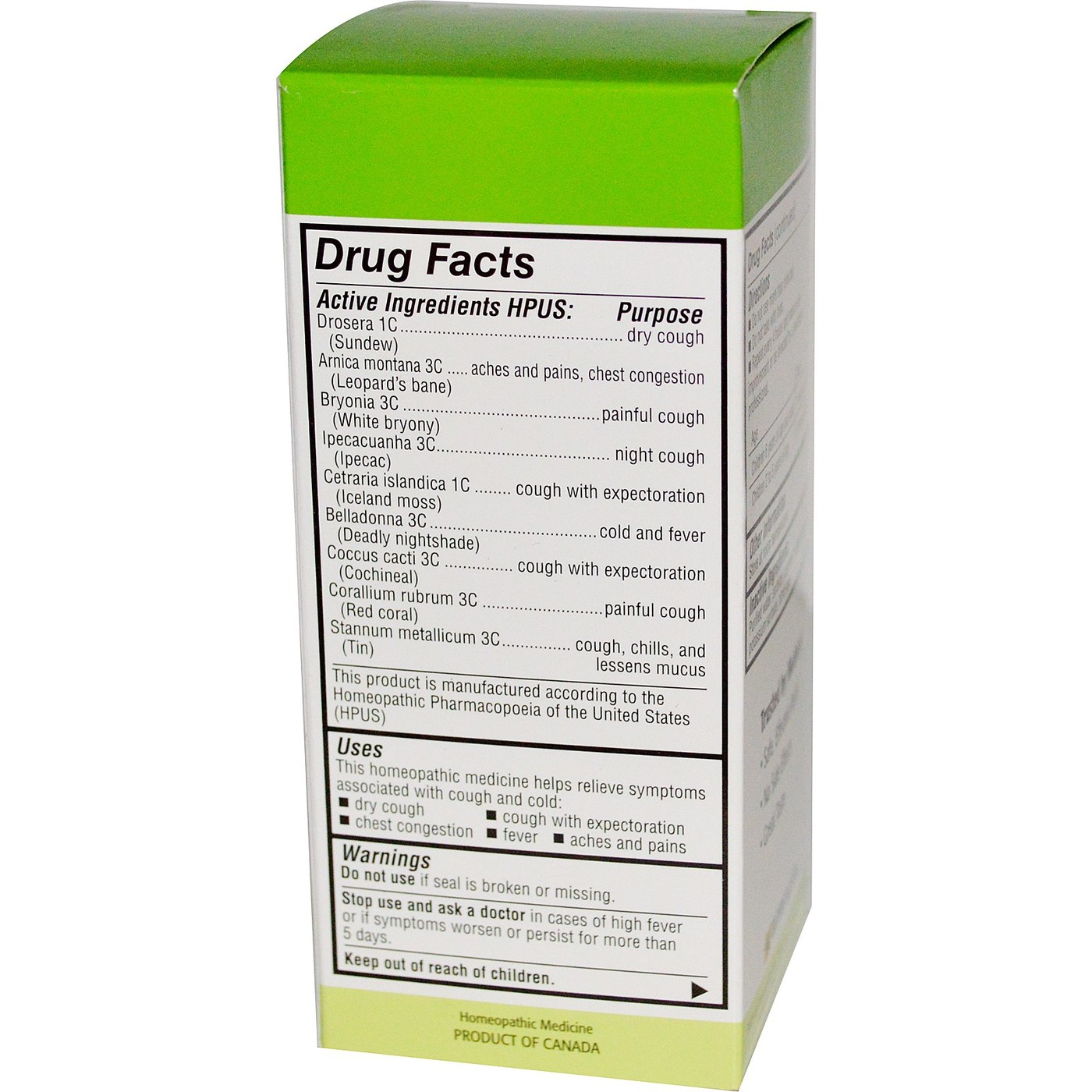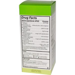 Active Ingredients HPUS: Drosera 1C (Sundew), Arnica montana 3c (Leopard’s bane), Bryonia 3C (White bryony), Ipecacuanha 3C (Ipecac), Cetraria islandica 1C (Iceland moss), Belladonna 3C (Deadly nightshade), Coccus cacti 3C (Cochineal), Corallium rubrum 3C (Red coral) and Stannum metallicum 3C (Tin).