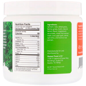 Spinach, kale, wheat grass, barley grass, inulin, natural lemon flavor, magnesium ascorbate, monk fruit extract, malic acid, guar gum, stevia, spirulina, and licorice root extract.