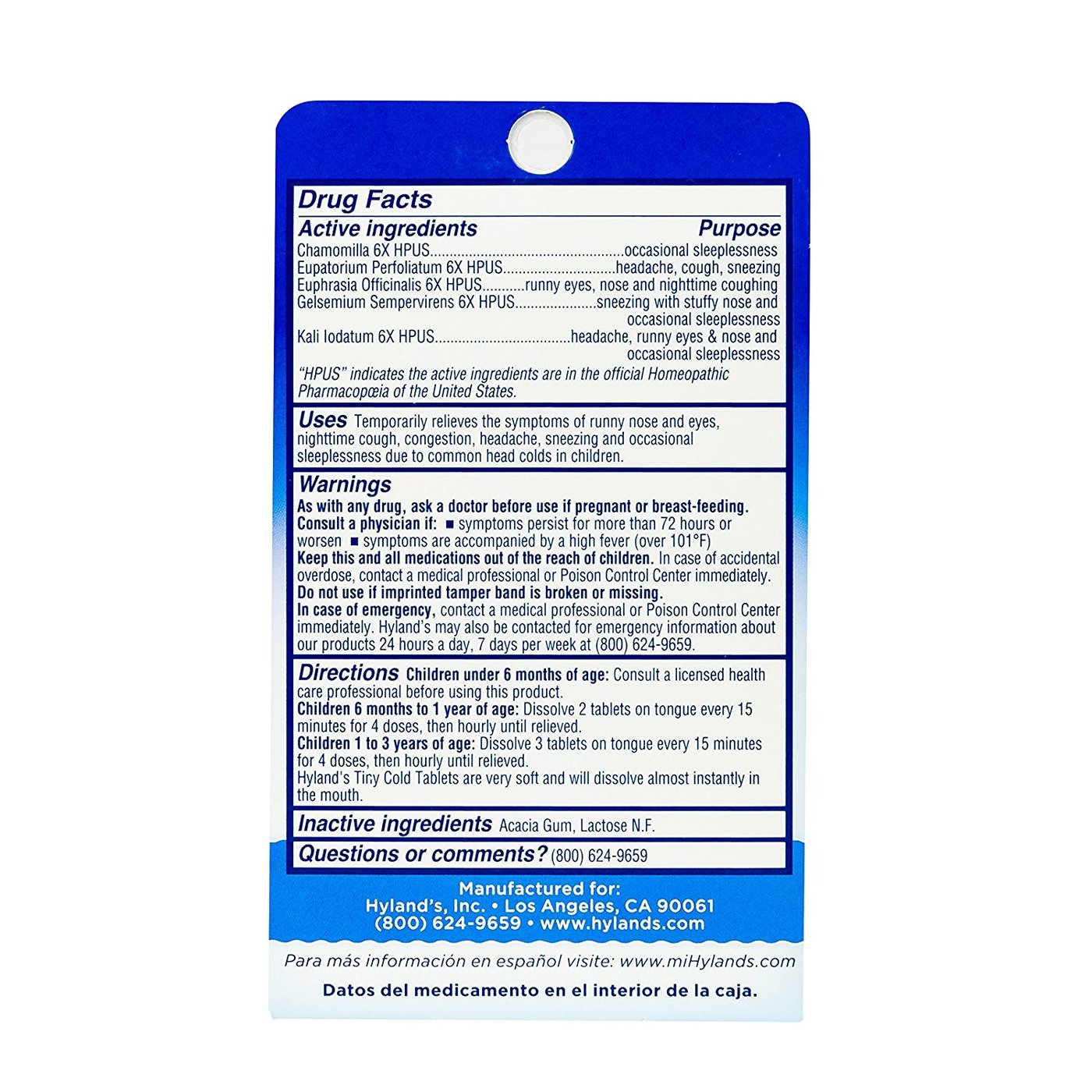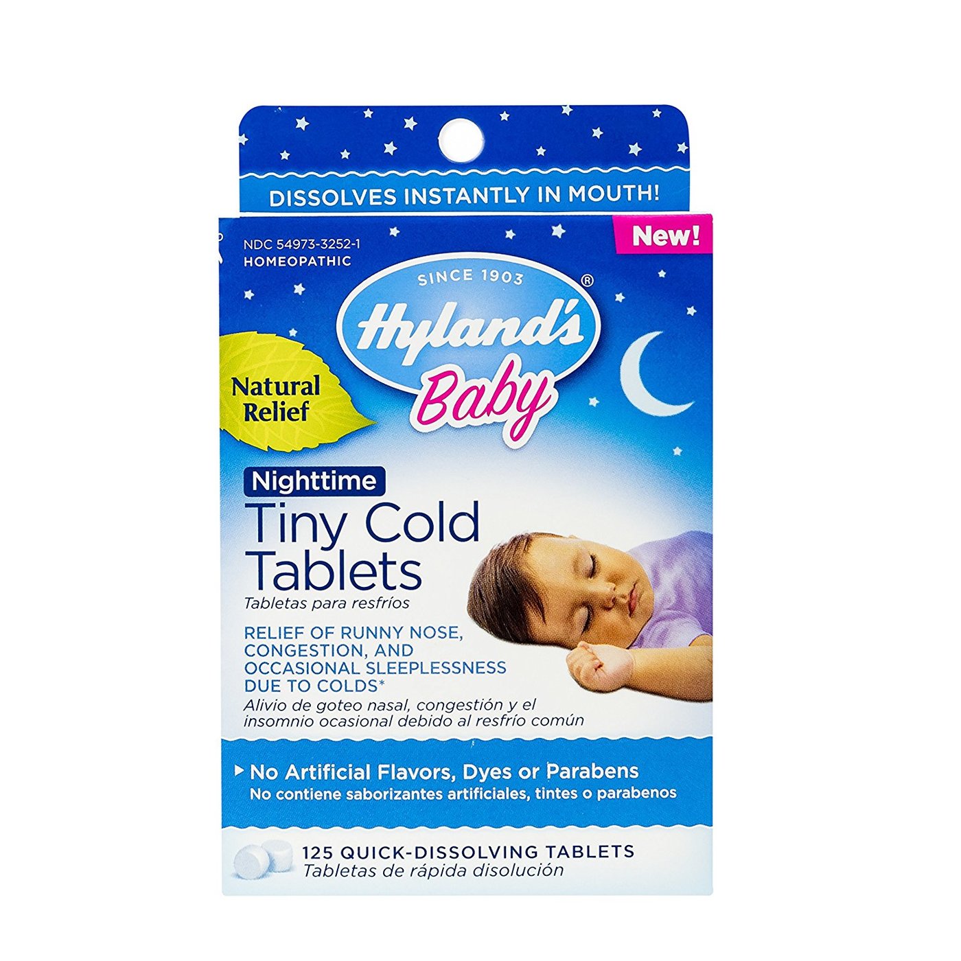 Hyland’s Baby Nighttime Tiny Cold Tablets contains no parabens or artificial flavors.