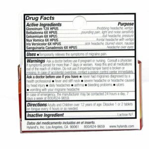 Ingredients: Glonoinum 12X HPUS, Belladonna 6X HPUS, Gelsemium 6X HPUS, Nux vomica 6X HPUS, Iris versicolor 6X HPUS and Sanguinaria canadensis 6X HPUS.