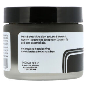 White clay, activated charcoal, glycerin (vegetable), tocopherol (vitamin E), and pure essential oils.
