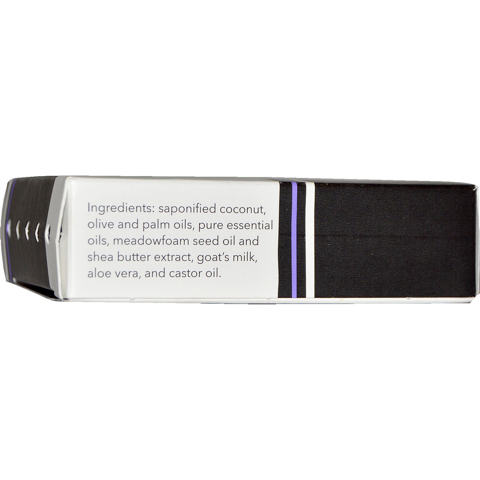 Óleos de coco, azeite e palmeira saponificados, óleos essenciais puros, óleo de semente de meadowfoam e extrato de manteiga de karité, leite de cabra, leite de aloe vera e óleo de rícino.