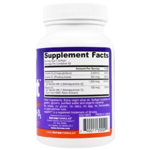 O K-Right da Jarrow Formulas é uma combinação sinérgica de três formas da vitamina K: MK-7, MK-4 e K1, além da vitamina D3 para promover a saúde óssea e cardiovascular. A vitamina K é essencial para a carboxilação da osteocalcina, que une o cálcio aos ossos. A vitamina D3 é essencial para a produção de osteocalcina. O MK-7 da Jarrow Formulas é um produto de fermentação natural utilizando Bacillus subtilis subsp. Natto.