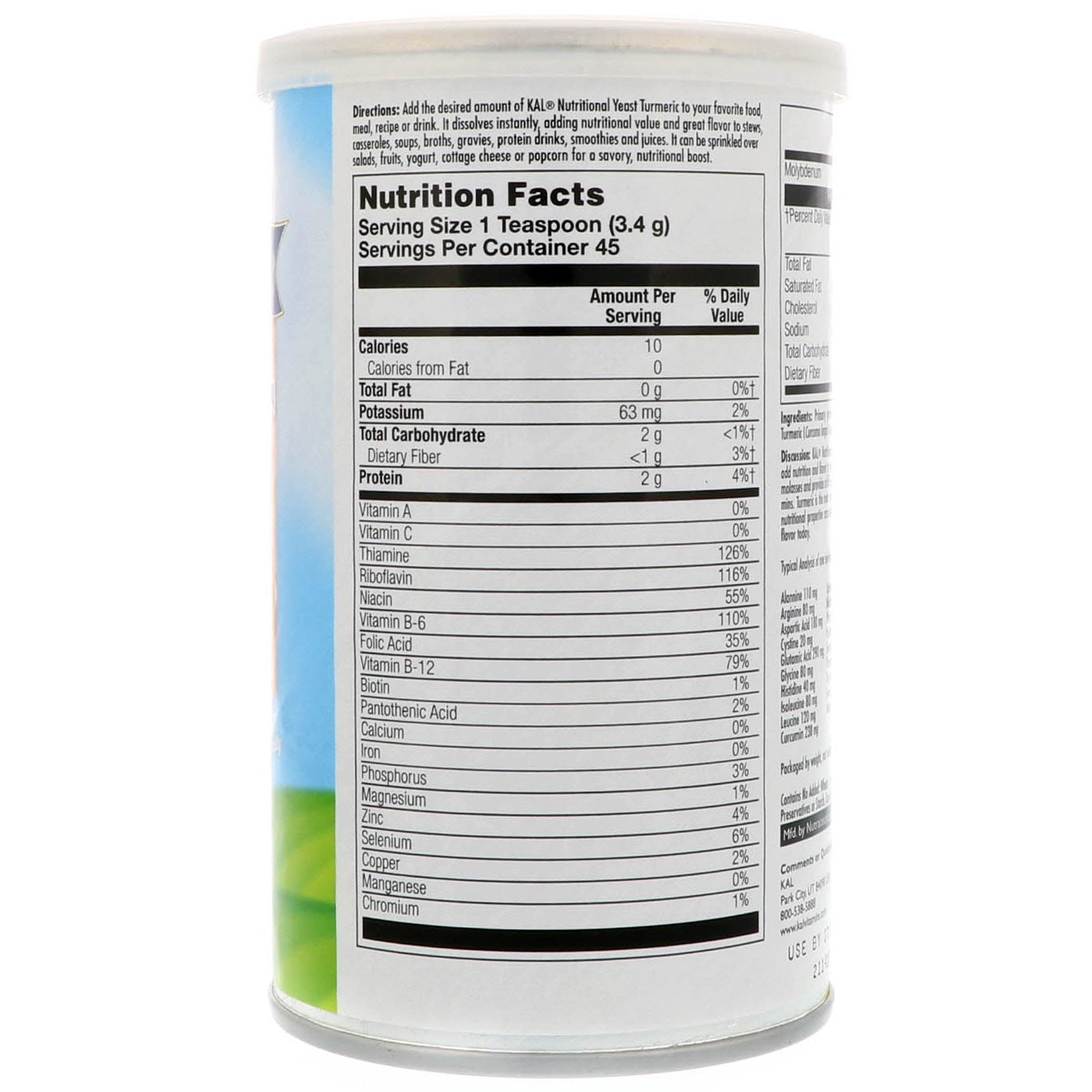 Add the desired amount of KAL Nutritional Yeast Turmeric to your favorite food, meal, recipe or drink. It dissolves instantly, adding nutritional value and great flavor to stews, casseroles, soups, broths, gravies, protein drinks, smoothies and juices. It can be sprinkled over salads, fruits, yogurt, cottage cheese or popcorn for a savory, nutritional boost.
