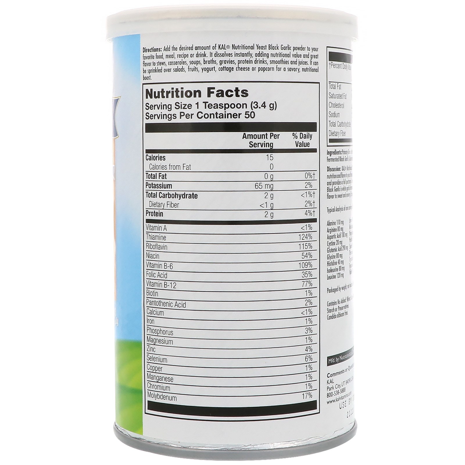 Discussion: KAL Nutritional Yeast Black Garlic is a unique combination intended to add nutrition and flavor to your favorite recipes. Our Nutritional Yeast is primary grown on molasses and provides a full spectrum of essential amino acids and balanced variety of B Vitamins. Our Black Garlic is white garlic fermented under mild heat. This changes the color to black and the flavor to sweet and savory. Experiment with the savory, roasted flavor today.