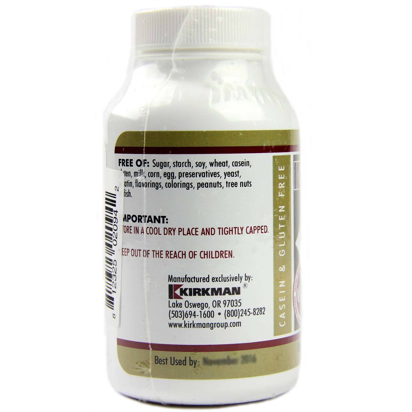 Notas: Hypoallergenic. Free of sugar, starch, soy, wheat, casein, gluten, milk, corn, egg, preservatives, yeast, gelatin, flavorings, colorings, peanuts, tree nuts or fish.